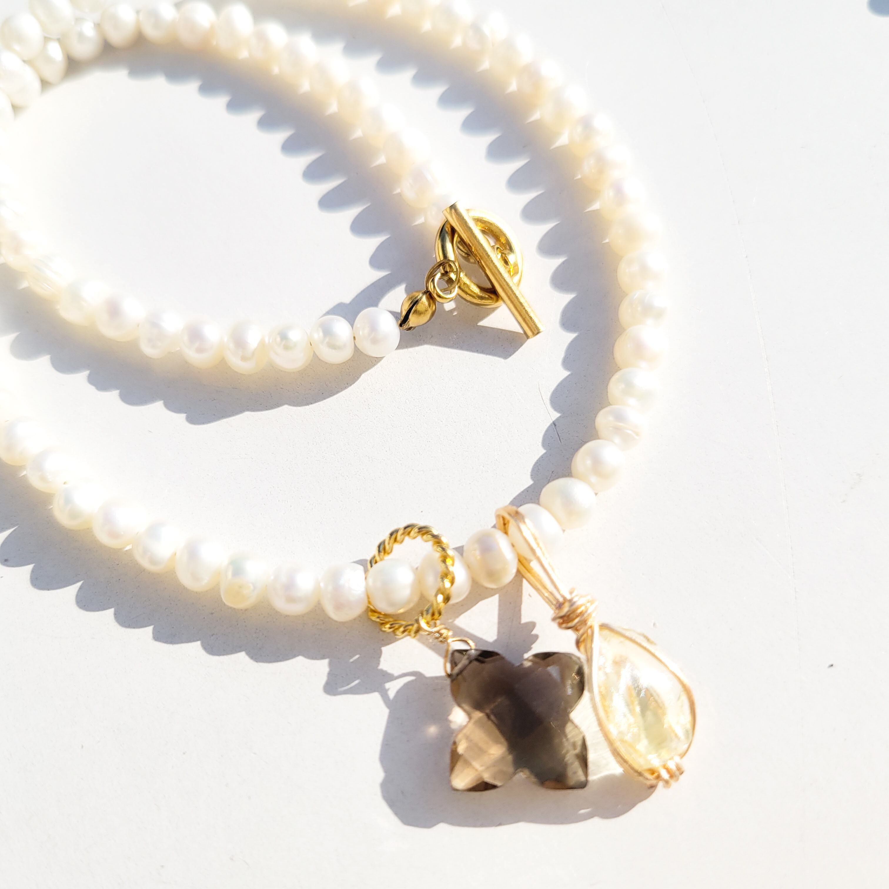 淡水パールネックレスにアンダラクリスタルとスモーキークォーツのトップをセットし、付け方次第で何通りにもなるセットとなってます✩.*˚