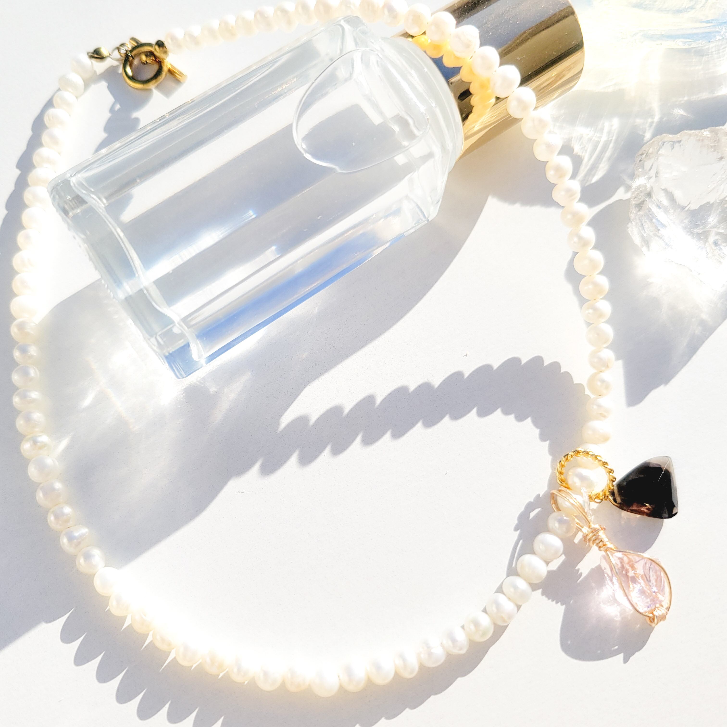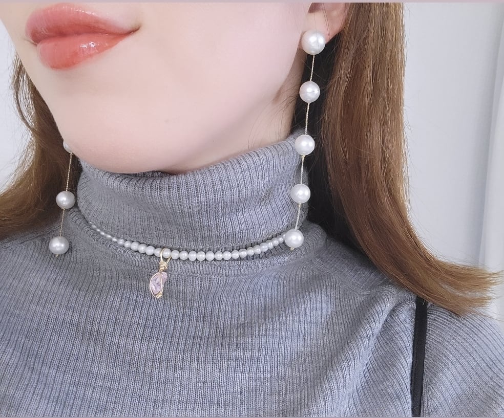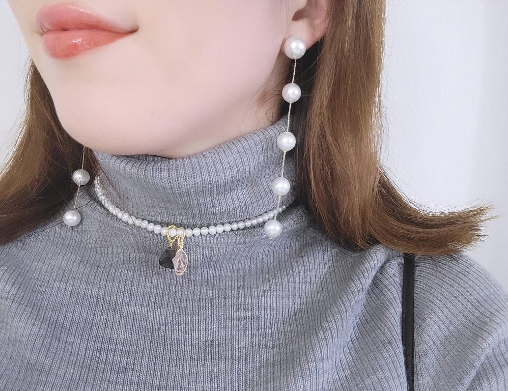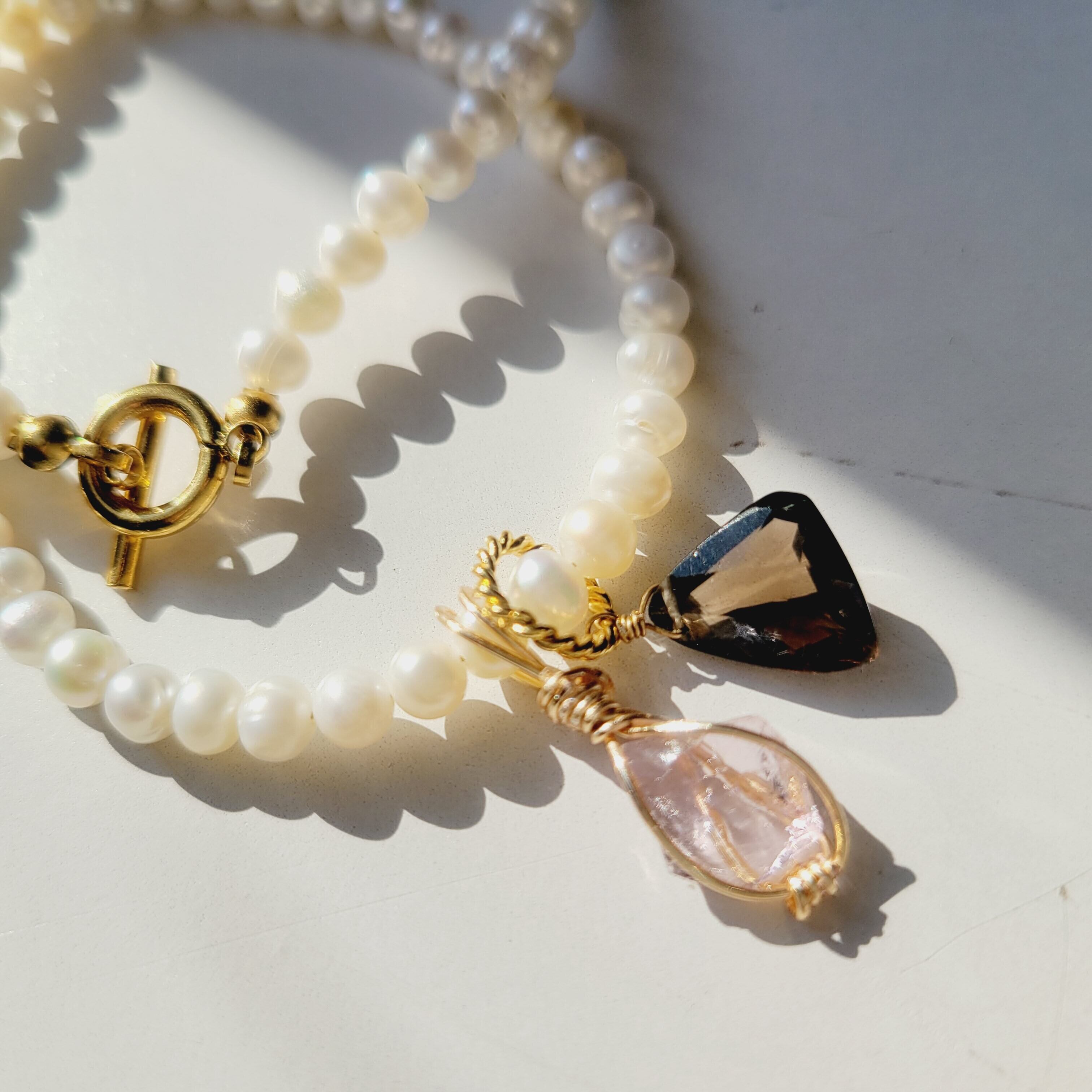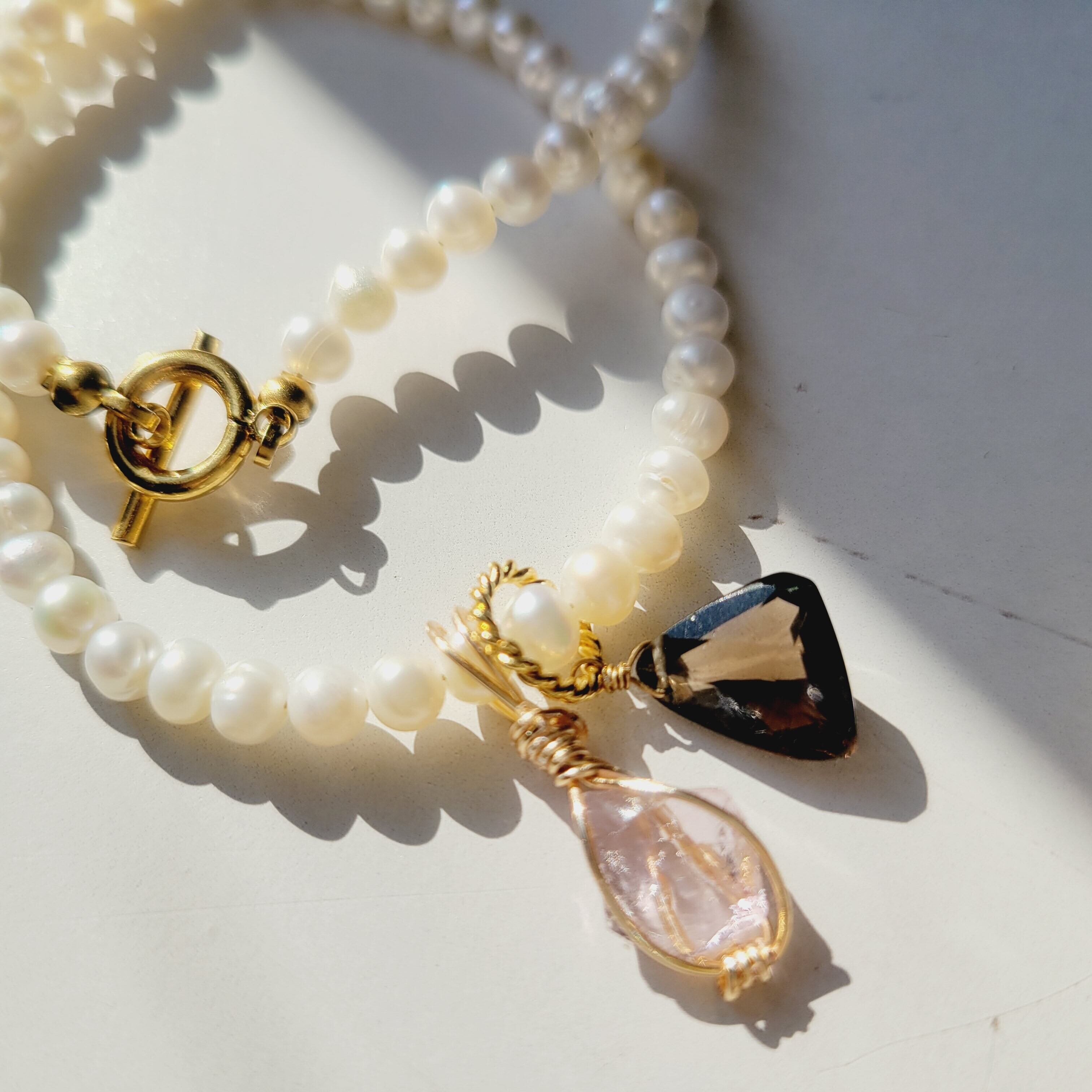 淡水パールネックレスにアンダラクリスタルとスモーキークォーツのトップをセットし、付け方次第で何通りにもなるセットとなってます( ˃ ᵕ ˂ )